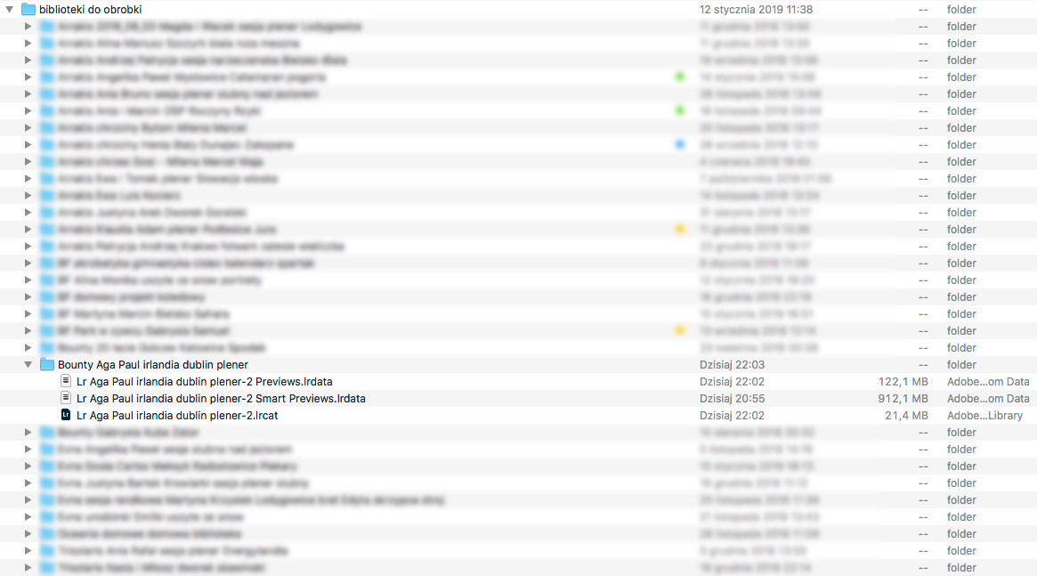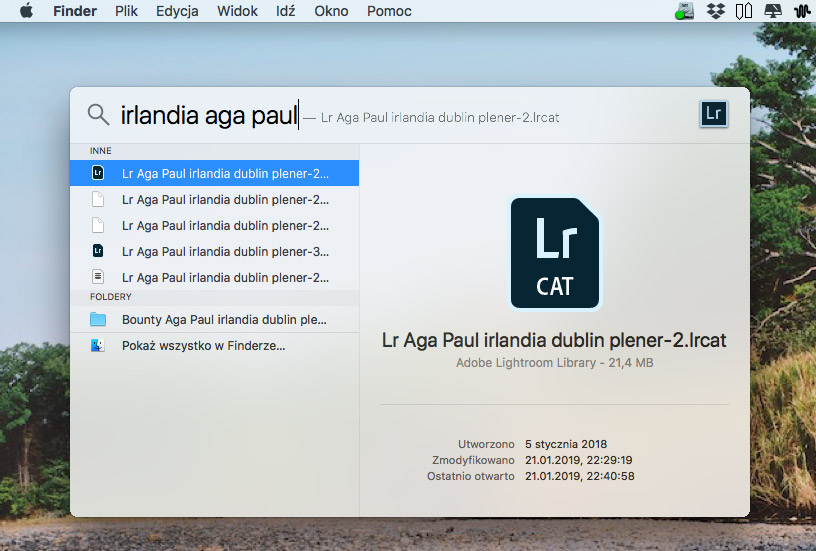 Dodatkową funkcją, wygodą w zarządzaniu zdjęciami oraz bibliotekami lightrooma jest Mac’owa lupka (spotlight). Dzięki niej bardzo szybko po nazwach i słowach kluczowych znajduję w swoim systemie pliki RAW i pliki bibliotek danego reportażu ślubnego.